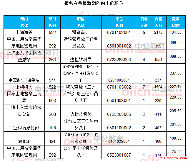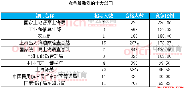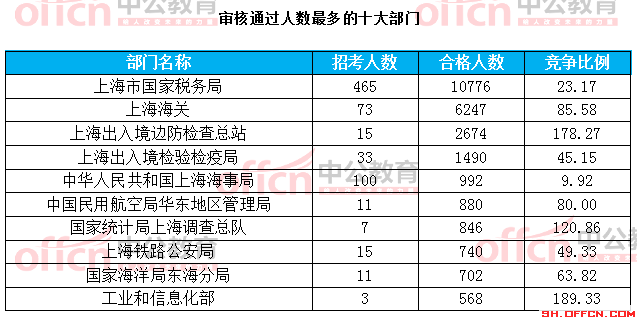 為幫助廣大考生更清晰的了解今日?qǐng)?bào)名情況,上海中公網(wǎng)校整理了審核通過(guò)人數(shù)前十位的部門(mén)以及競(jìng)爭(zhēng)比例最激烈的十大部門(mén),供廣大考生參考: