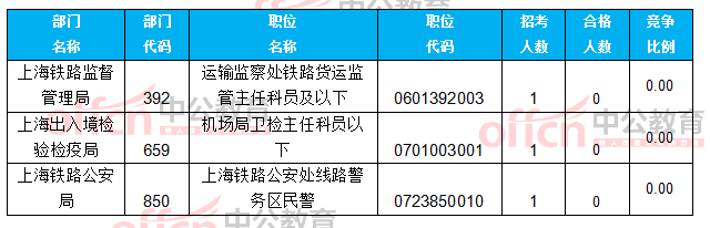 截止到24日18時(shí),工作地點(diǎn)在上海的職位共有3個(gè)無(wú)人報(bào)考,占全部職位的0.88%。下面是無(wú)人報(bào)考職位一覽表,中公網(wǎng)校專家建議廣大考生多關(guān)注一些較冷職位,避免激烈競(jìng)爭(zhēng),結(jié)合自身?xiàng)l件,找到屬于自己的職位。