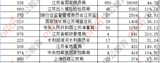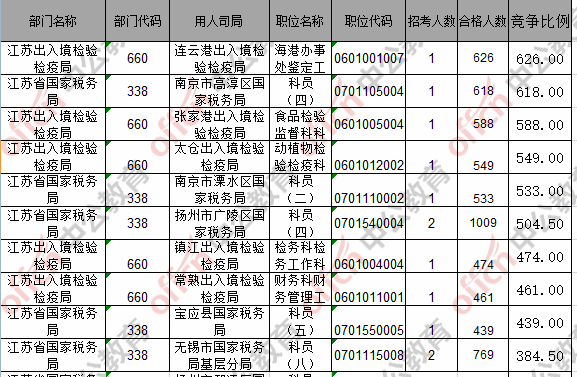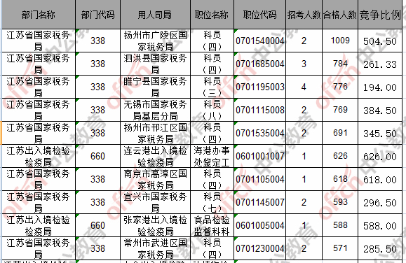 報(bào)名通過審核人數(shù)前十的職位主要集中在江蘇省國(guó)家稅務(wù)局、江蘇出入境檢驗(yàn)檢疫局,具體信息如下: