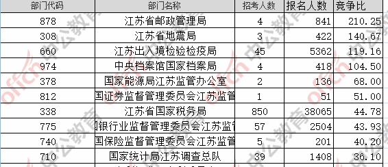 為幫助廣大考生更清晰的了解今日?qǐng)?bào)名情況,江蘇中公網(wǎng)校整理了審核通過人數(shù)前十位的部門以及競(jìng)爭(zhēng)比例最激烈的十大部門,供廣大考生參考: