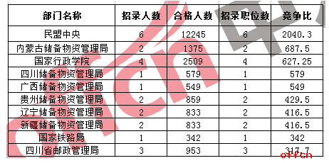 2017國考競爭最激烈部門毫無懸念由民盟中央獲得,該部門僅招錄6人,合格人數(shù)已經12245:1,競爭比達2040:1,這也是因為報考職位出自民盟中央,以此拉高了整體競爭比例,除此以外,儲備物資管理局也是考生競爭的部門,競爭最激烈的十大部門中,就有六個來自此系統(tǒng),競爭比達687.5:1。