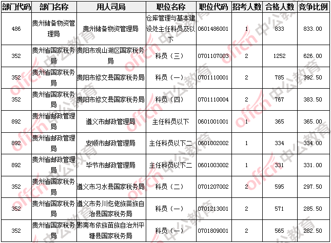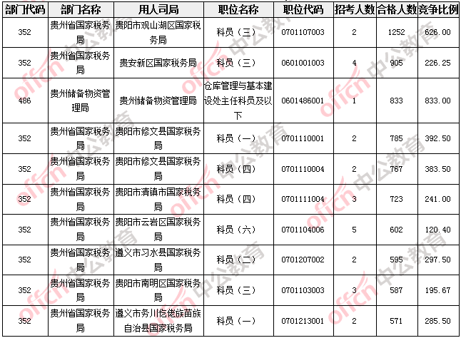 報名通過審核人數(shù)較多的職位主要集中在貴州省國家稅務(wù)局、貴州儲備物資管理局兩大部門,具體信息如下: