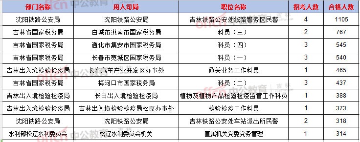 報名通過審核人數(shù)前十的職位主要集中在吉林省國稅局和吉林出入境檢驗(yàn)檢疫局,具體信息如下: