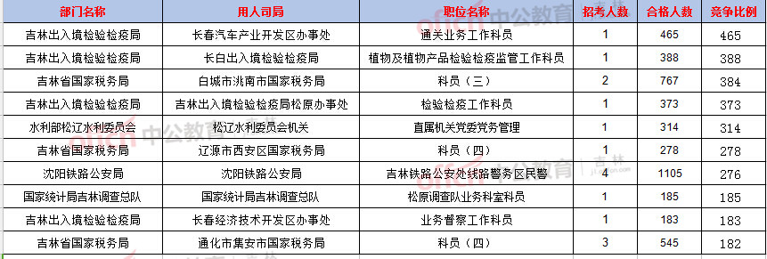 截止到24日17:30,競爭比例的職位為吉林鐵路公安處線路警務(wù)區(qū)民警一職,招錄4人,截止到24日17:30通過人數(shù)為1105人。其次為吉林省國稅局部門。