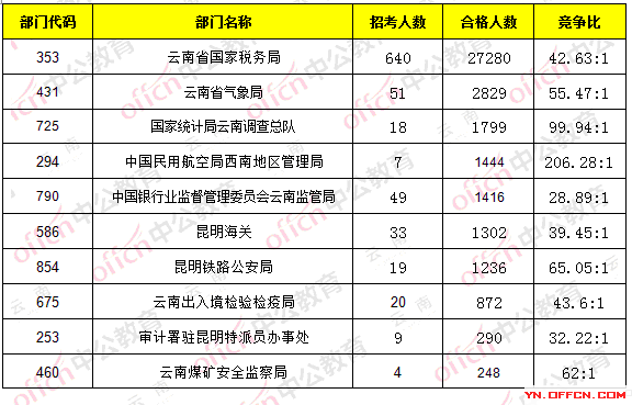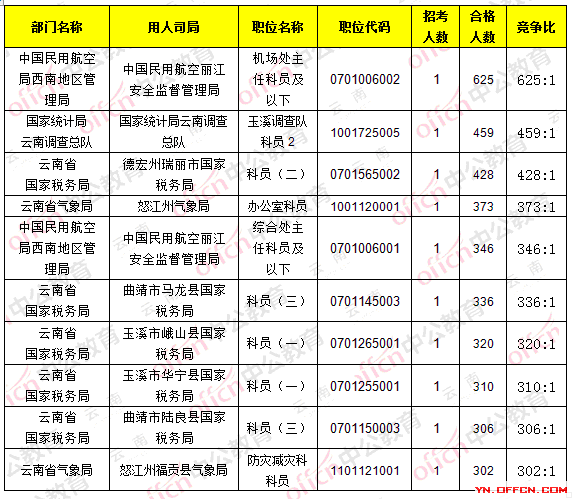 報名通過審核人數(shù)前十的職位主要集中在中國民用航空局西南地區(qū)管理局、云南省國家稅務局、國家統(tǒng)計局云南調查總隊等部門,具體信息如下: