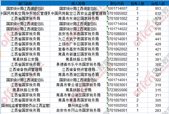 報(bào)名通過(guò)審核人數(shù)前二十的職位主要集中在江西省國(guó)家稅務(wù)局、國(guó)家統(tǒng)計(jì)局江西調(diào)查總隊(duì)具體信息如下