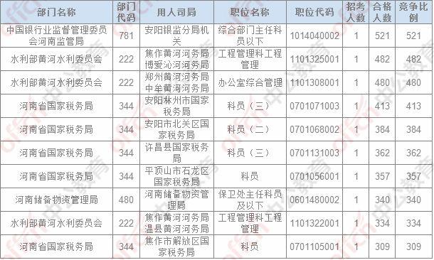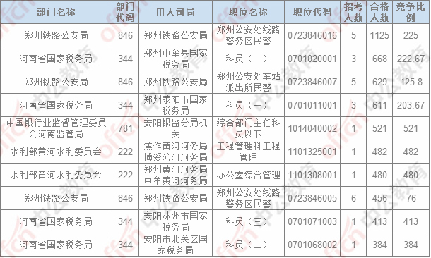 報(bào)名通過審核人數(shù)排名前列的職位主要集中在鄭州鐵路公安局、河南省國(guó)家稅務(wù)局,中國(guó)銀行業(yè)監(jiān)督管理委員會(huì)河南監(jiān)管局,具體信息如下: