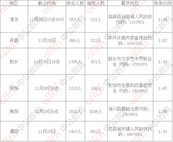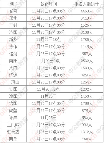 中公網(wǎng)校還就各地區(qū)的各崗位具體報(bào)名人數(shù)進(jìn)行了統(tǒng)計(jì)分析,截止11月25日下午17點(diǎn)30分,河南省考部分地區(qū)崗位的具體報(bào)名情況如下: