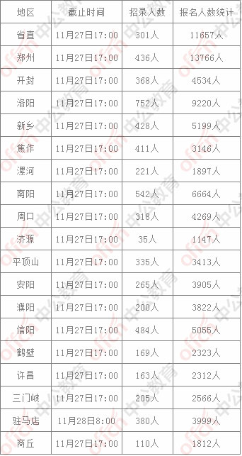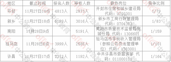 中公教育還就各地區(qū)的各崗位具體報名人數進行了統(tǒng)計分析,截至11月27日,河南省考部分地區(qū)崗位的具體報名情況如下: