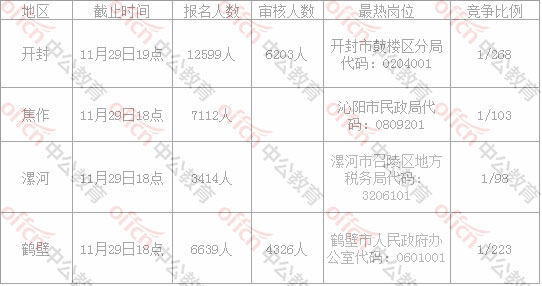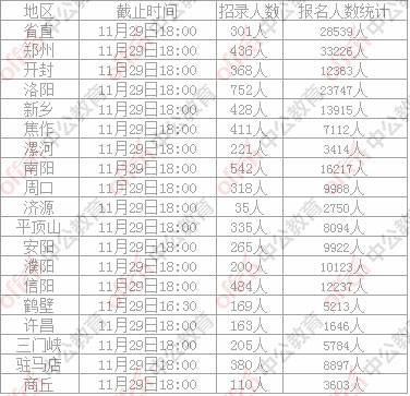 中公教育還就各地區(qū)的各崗位具體報(bào)名人數(shù)進(jìn)行了統(tǒng)計(jì)分析,截至11月29日,河南省考部分地區(qū)崗位的具體報(bào)名情況如下:
