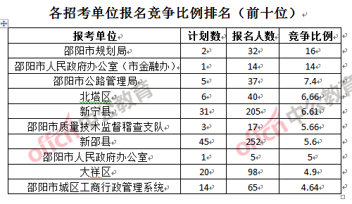 競爭熱門招考單位,前三位依次是:邵陽市規(guī)劃局(競爭比例16:1)、邵陽市人民政府辦公室(市金融辦)(競爭比例14:1)和邵陽市公路管理局(競爭比例7.4:1)。