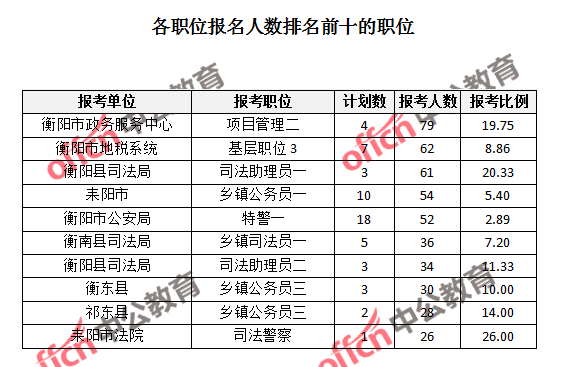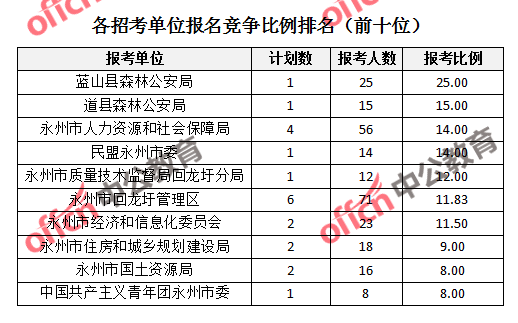 競爭熱門招考單位,前三位依次是:藍(lán)山縣森林公安局(競爭比例25:1)、道縣森林公安局(競爭比例15:1)和永州市人力資源和社會局(競爭比例14:1)、民盟永州市委(競爭比例14:1)。