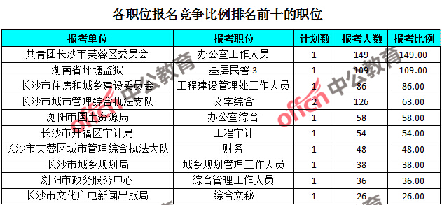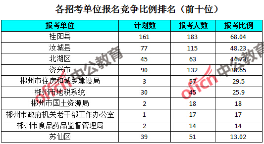 為幫助廣大考生更清晰的了解報(bào)名情況,中公教育整理了郴州市各招考單位的報(bào)名人數(shù)排名以及競(jìng)爭(zhēng)比例排名,供廣大考生參考: