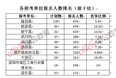 為幫助廣大考生更清晰的了解報名情況,中公教育整理了邵陽各招考單位的報名人數(shù)排名以及競爭比例排名,供廣大考生參考: