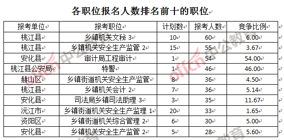 競(jìng)爭(zhēng)熱門職位,前三位依次是:安化縣審計(jì)局工程審計(jì)(競(jìng)爭(zhēng)比例54:1)、桃江縣公安局特警(競(jìng)爭(zhēng)比例46:1)、益陽(yáng)市城市管理行政執(zhí)法局直屬四大隊(duì)市容管理1(競(jìng)爭(zhēng)比例20:1)