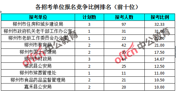 競(jìng)爭(zhēng)熱門招考單位,前三位依次是:郴州市住房和城鄉(xiāng)建設(shè)局(競(jìng)爭(zhēng)比例32.33:1)、郴州市政府機(jī)關(guān)老干部工作辦公室(競(jìng)爭(zhēng)比例31:1)和郴州市老齡工作委員會(huì)辦公室(競(jìng)爭(zhēng)比例22:1)。
