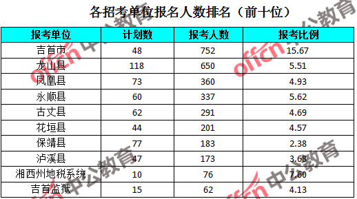 為幫助廣大考生更清晰的了解報(bào)名情況,中公教育整理了湖南湘西各招考單位的報(bào)名人數(shù)排名以及競爭比例排名,供廣大考生參考: