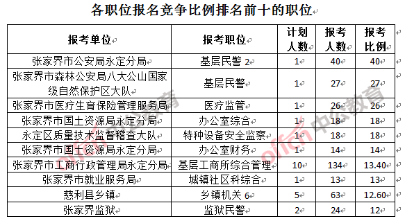 競爭最熱門職位,前三位依次是:張家界市公安局永定分局基層民警2(競爭比例40:1)、張家界市森林公安局八大公山自然保護區(qū)大隊基層民警(競爭比例27:1)和張家界市醫(yī)療生育保險管理服務(wù)局醫(yī)療監(jiān)管(競爭比例26:1)。