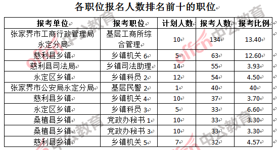 為幫助廣大考生更清晰的了解報名情況,中公教育整理了張家界市各職位的報名人數(shù)排名以及競爭比例排名,供廣大考生參考: