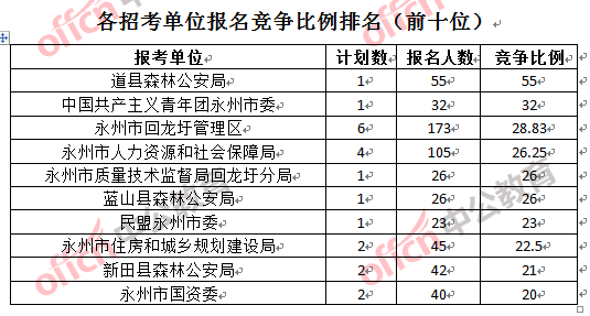 競爭熱門招考單位,前三位依次是:道縣森林公安局(競爭比例55:1)、中國共產(chǎn)主義青年團永州市委(競爭比例32:1)和永州市回龍圩管理區(qū)(競爭比例28.83:1)。