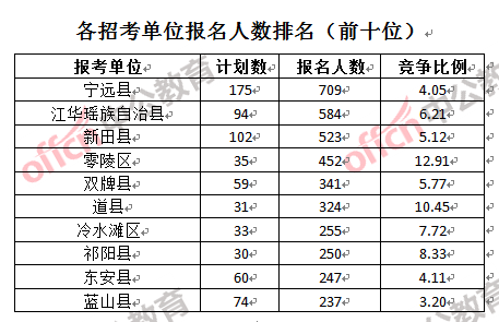 為幫助廣大考生更清晰的了解報名情況,中公教育整理了永州各招考單位的報名人數(shù)排名以及競爭比例排名,供廣大考生參考: