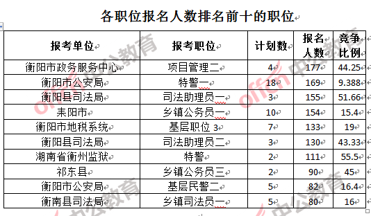競爭熱門招考單位,前三位依次是:耒陽市法院(競爭比例58.5:1)、衡陽縣司法局(競爭比例47.5:1)和衡陽市政務(wù)服務(wù)中心(競爭比例28.25:1)。