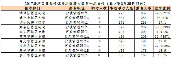 報(bào)名期間最后一次的2017年濰坊公務(wù)員報(bào)名人數(shù)統(tǒng)計(jì)終于發(fā)布。據(jù)統(tǒng)計(jì)截止到25日17:00已經(jīng)報(bào)名總?cè)藬?shù)未公布,審核通過總?cè)藬?shù)為:16770人,已經(jīng)繳費(fèi)總?cè)藬?shù)為:7131人。截止目前濰城區(qū)轄區(qū)街辦行政管理職位審核通過人數(shù)392人,繳費(fèi)人數(shù)139人,成為審核人數(shù)最多,已交費(fèi)人數(shù)最多的崗位。中共濰坊市委農(nóng)工辦行政管理職位過審人數(shù)和招考人數(shù)比為230:1。另外截止到今天17:00濰坊市還有6個(gè)崗位無人通過審核,26崗位無人繳費(fèi)。木木在這里提醒大家:2017濰坊公務(wù)員考試報(bào)名已經(jīng)進(jìn)行到第3日,還剩一天的報(bào)名時(shí)間,希望還在觀望的考生該出手時(shí)就出手,按照往年報(bào)名情況預(yù)計(jì),明天很容易出現(xiàn)報(bào)名系統(tǒng)不穩(wěn)定以及審核不通過等原因?qū)е聢?bào)名不的情況,請(qǐng)考生注意。另外還有部分崗位還未審核的考生及時(shí)關(guān)注審核信息就是修改審核信息;已經(jīng)審核通過的考生記得繳費(fèi)截止時(shí)間為3月26日16:00。祝大家報(bào)考順利。具體數(shù)據(jù)詳見下表: