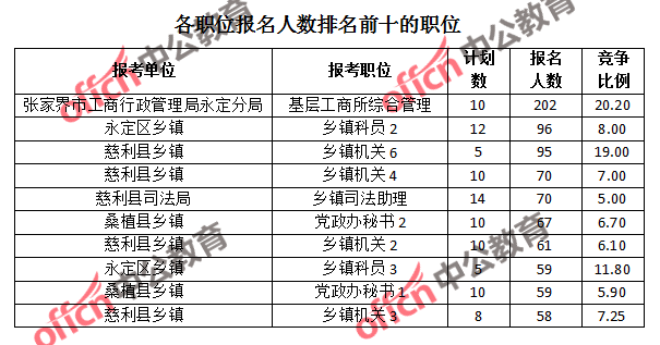 為幫助廣大考生更清晰的了解報名情況,中公教育整理了張家界市各職位的報名人數(shù)排名以及競爭比例排名,供廣大考生參考: