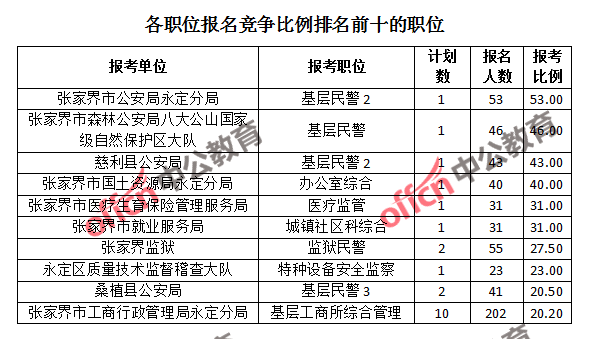 競爭熱門職位,前三位依次是:張家界市公安局永定分局基層民警2(競爭比例53:1)、張家界市森林公安局八大公山自然保護區(qū)大隊基層民警(競爭比例46:1)和慈利縣公安局基層民警2(競爭比例43:1)。