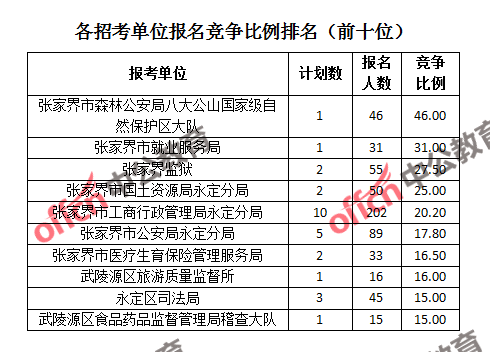 競爭熱門招考單位,前三位依次是:張家界市森林公安局八大公山自然保護區(qū)大隊(競爭比例46:1)、張家界市就業(yè)服務局(競爭比例31:1)和張家界監(jiān)獄(競爭比例27.5:1)。