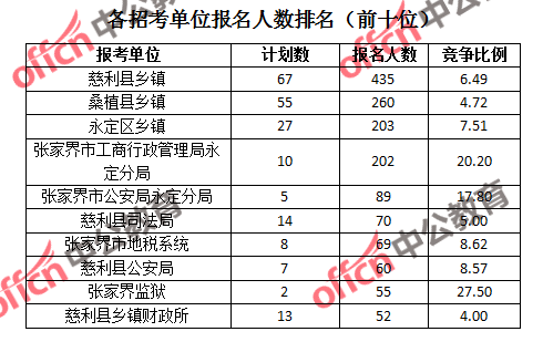 為幫助廣大考生更清晰的了解報名情況,中公教育整理了張家界市各招考單位的報名人數(shù)排名以及競爭比例排名,供廣大考生參考: