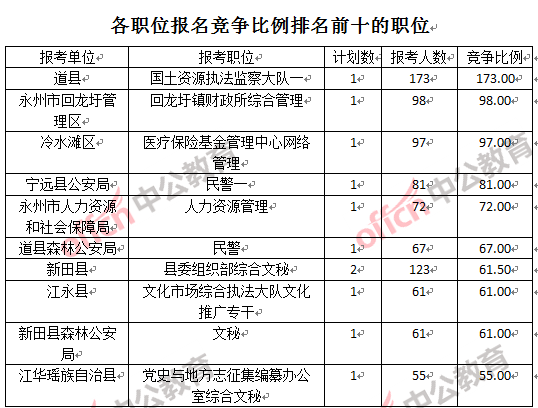 為幫助廣大考生更清晰的了解報(bào)名情況,中公教育整理了永州市各招考單位的報(bào)名人數(shù)排名以及競(jìng)爭(zhēng)比例排名,供廣大考生參考: