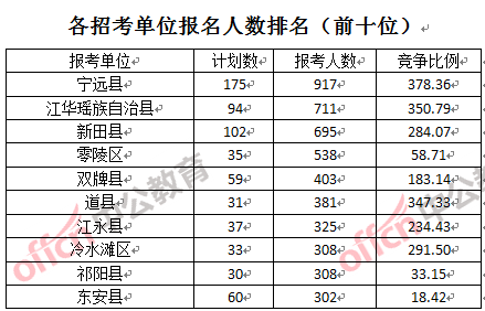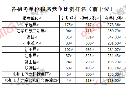 競(jìng)爭(zhēng)熱門招考單位,前三位依次是:寧遠(yuǎn)縣(競(jìng)爭(zhēng)比例378:1)、江華瑤族自治縣(競(jìng)爭(zhēng)比例350:1)和道縣(競(jìng)爭(zhēng)比例347:1)。