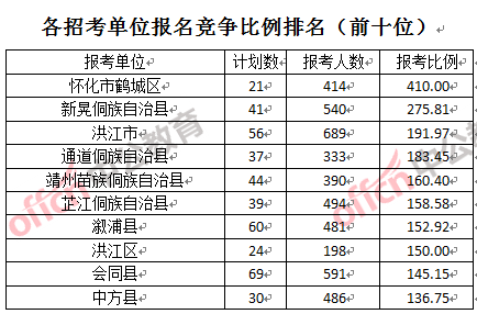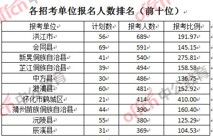 競爭熱門招考單位,前三位依次是:懷化市鶴城區(qū)(競爭比例410:1)、新晃侗族自治縣(競爭比例275:1)和洪江市(競爭比例191:1)。