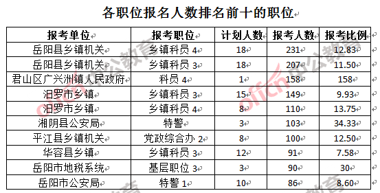 為幫助廣大考生更清晰的了解報(bào)名情況,中公教育整理了岳陽市各職位的報(bào)名人數(shù)排名以及競爭比例排名,供廣大考生參考: