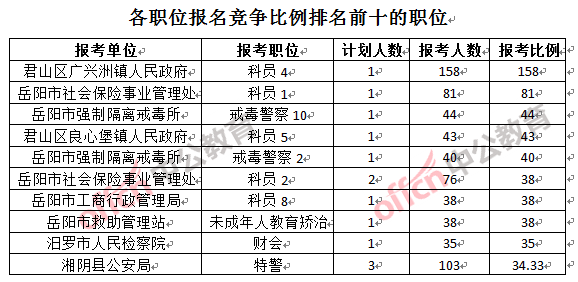 競爭最熱門職位,前三依次是:君山區(qū)廣興洲鎮(zhèn)人民政府科員4(競爭比例158:1)、岳陽市社會(huì)保險(xiǎn)事業(yè)管理處科員1(競爭比例81:1)和岳陽市強(qiáng)制隔離戒毒所戒毒警察10(競爭比例44:1)。