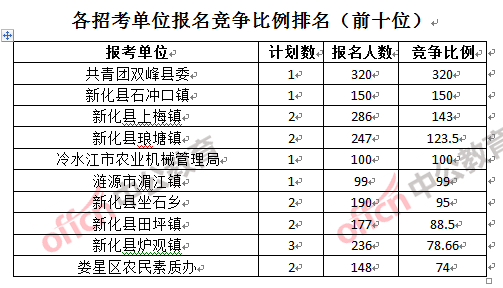 競爭熱門招考單位,前三位依次是:共青團雙峰縣委(競爭比例320:1)、新化縣石沖口鎮(zhèn)(競爭比例150:1)和新化縣上梅鎮(zhèn)(競爭比例143:1)。