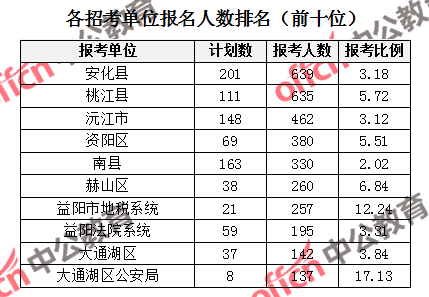 為幫助廣大考生更清晰的了解報(bào)名情況,中公網(wǎng)校整理了益陽市各招考單位的報(bào)名人數(shù)排名以及競(jìng)爭(zhēng)比例排名,供廣大考生參考:
