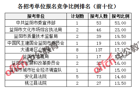 競(jìng)爭(zhēng)熱門招考單位,前三位依次是:中共益陽市委宣傳部(競(jìng)爭(zhēng)比例53:1)、益陽市文化市場(chǎng)綜合執(zhí)法局(競(jìng)爭(zhēng)比例23:1)、益陽市質(zhì)量技術(shù)監(jiān)督局(競(jìng)爭(zhēng)比例19.5:1)。