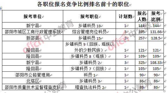 為幫助廣大考生更清晰的了解報(bào)名情況,中公網(wǎng)校整理了邵陽(yáng)市各職位的報(bào)名人數(shù)排名以及競(jìng)爭(zhēng)比例排名,供廣大考生參考: