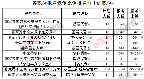 競爭最熱門職位,前三位依次是:張家界市森林公安局八大公山自然保護(hù)區(qū)大隊基層民警(競爭比例57:1)、張家界市公安局永定分局基層民警2(競爭比例54:1)和張家界市國土資源局永定分局辦公室綜合(競爭比例50:1)。