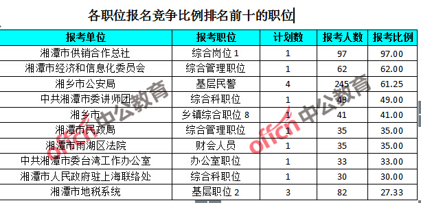 為幫助廣大考生更清晰的了解報(bào)名情況,中公網(wǎng)校整理了湘潭市各職位的報(bào)名人數(shù)排名以及競(jìng)爭(zhēng)比例排名,供廣大考生參考: