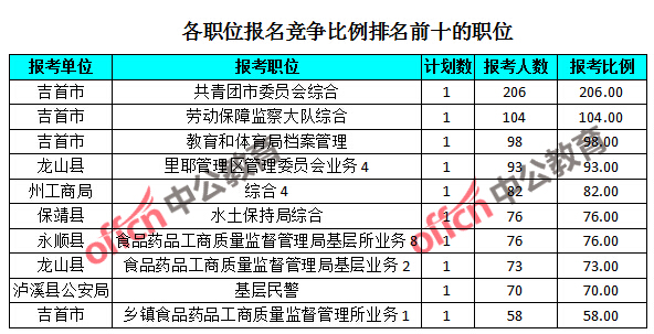 競爭熱門職位,前三位依次是:吉首市共青團(tuán)市委員會綜合(競爭比例206:1)、吉首市勞動監(jiān)察大隊(duì)綜合(競爭比例104:1)和吉首市教育和體育局檔案管理(競爭比例98:1)。