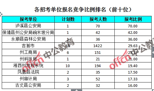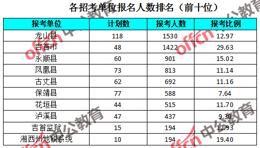 為幫助廣大考生更清晰的了解報名情況,中公網(wǎng)校整理了湖南湘西各招考單位的報名人數(shù)排名以及競爭比例排名,供廣大考生參考: