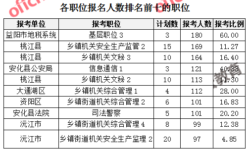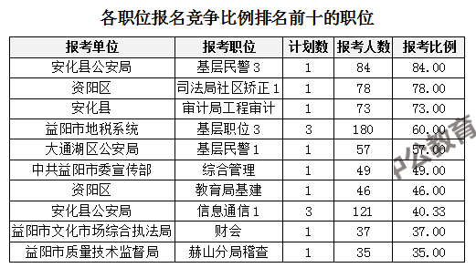 競(jìng)爭(zhēng)熱門職位,前三位依次是:安化縣公安局基層民警3(競(jìng)爭(zhēng)比例84:1)、資陽(yáng)區(qū)司法局社區(qū)矯正1(競(jìng)爭(zhēng)比例78:1)、安化縣審計(jì)局工程審計(jì)(競(jìng)爭(zhēng)比例73:1)。