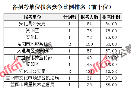 競(jìng)爭(zhēng)熱門(mén)招考單位,前三位依次是:安化縣公安局(競(jìng)爭(zhēng)比例84:1)、資陽(yáng)區(qū)(競(jìng)爭(zhēng)比例78:1)、安化縣(競(jìng)爭(zhēng)比例73:1)。