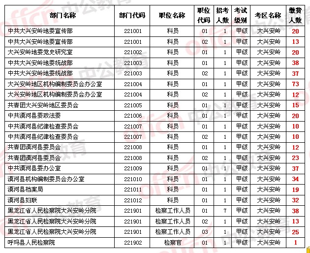 中公網(wǎng)校為參加2014年黑龍江省公務(wù)員考試的考生整理2014年黑龍江省公務(wù)員考試的大興安嶺考區(qū)報名人數(shù),由于報名網(wǎng)站報名情況每30分鐘統(tǒng)計一次,數(shù)據(jù)可能會有細(xì)微差異,所有數(shù)據(jù)僅供大家參考。
