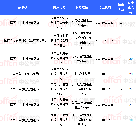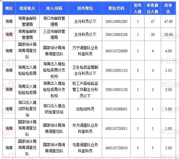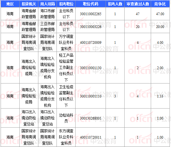 報(bào)名通過審核人數(shù)前十的職位主要集中在海南省郵政管理局、國(guó)家統(tǒng)計(jì)局海南調(diào)查總隊(duì)、海南出入境檢驗(yàn)檢疫局等部門,具體信息如下: