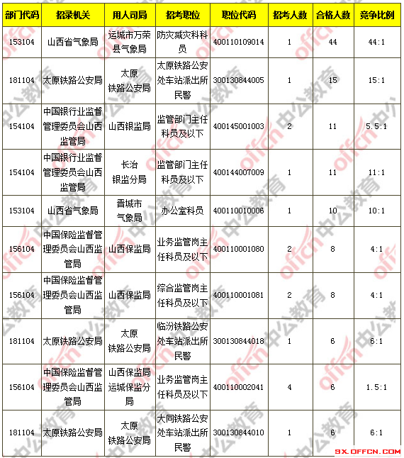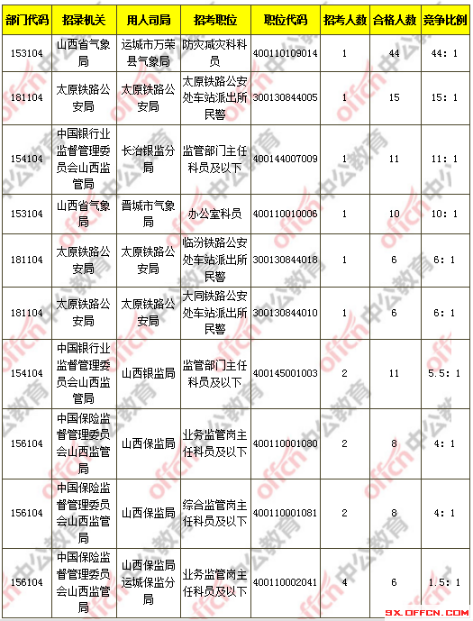 報名通過審核人數(shù)前十的職位主要集中在運城市萬榮縣氣象局、太原鐵路公安局、山西銀監(jiān)局等部門,具體信息如下: