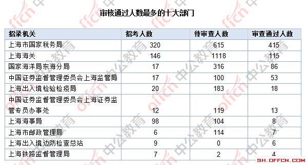 截止到31日10時(shí),通過審核人數(shù)前三位的部門依次是:上海市國家稅務(wù)局,上海海關(guān),國家海洋局東海分局,三部門通過審核總?cè)藬?shù)達(dá)616人,占通過審核總?cè)藬?shù)的83.58%。